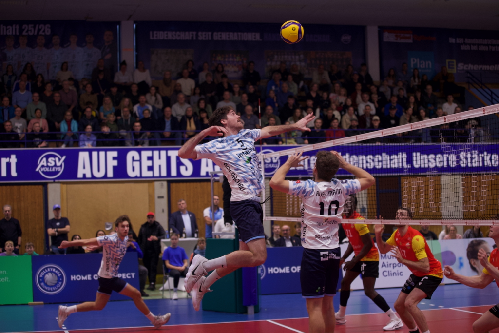 Beide Mannschaften starteten nervös in den ersten Satz, schließlich begann die Saison für beide wenige Tage zuvor auch mit einer 0:3-Niederlage. Die Hausherren legten mit Luca Russelmann im Zuspiel los, der in den ersten Ballwechseln seine Angreifer nicht immer fand, im Laufe des Satzes aber sicherer und sehr variabel agierte. Und so brachte er seine Mitspieler immer mehr in gute Situationen, aus denen die ASV Volleys mehr und mehr Sicherheit zogen. Auch im Aufschlag fand Dachau zunächst besser ins Spiel als die Baden Volleys. Alex King, Marius Büchi und Will Kuhns sorgten früh für erste Breaks und die Führung.
