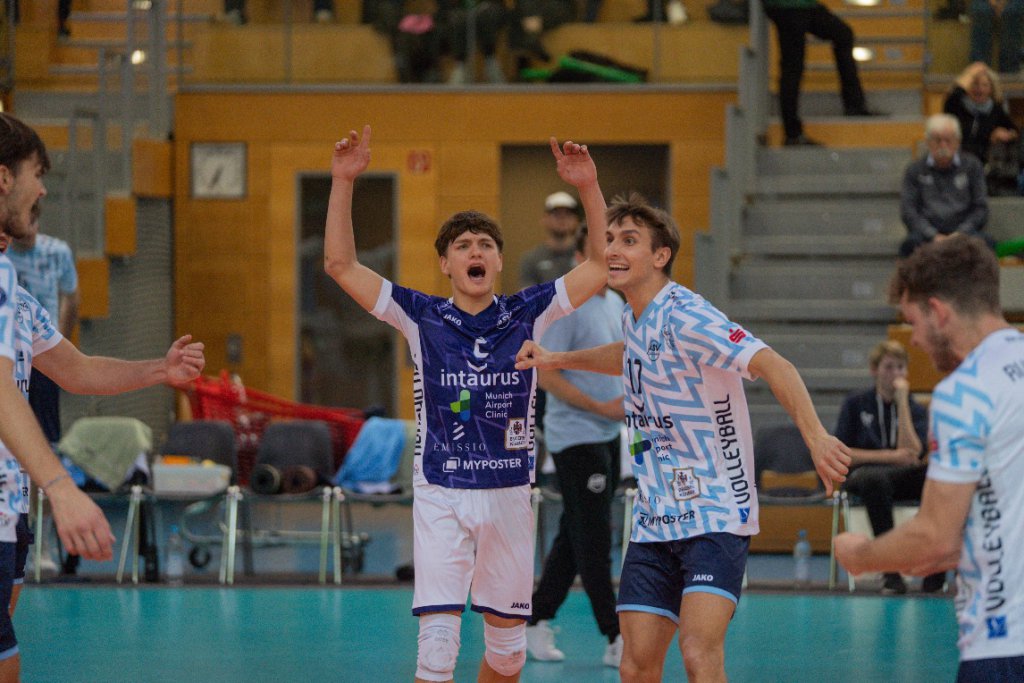 Der Jubel war am Ende groß, der erste Saisonsieg unter Dach und Fach: die ASV Volleys haben das Derby beim TSV Haching München mit 3:0 gewonnen (34:32, 26:24, 30:28).