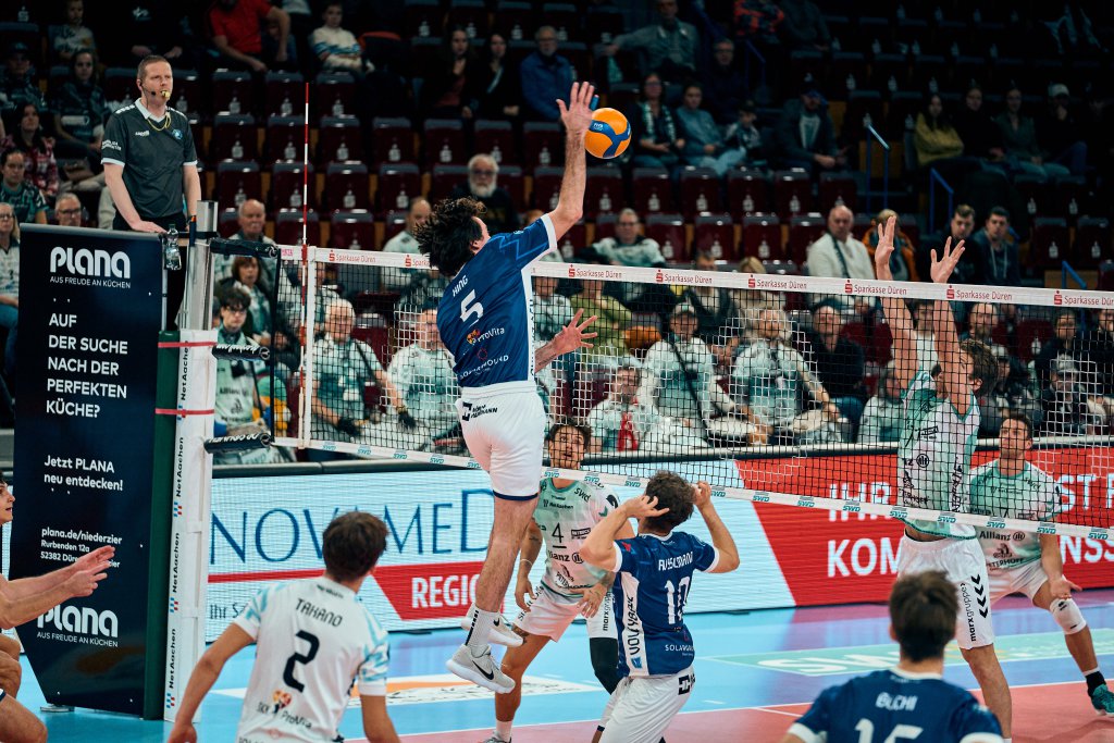 "Auch im ersten Satz haben wir es schon gut gemacht, auch wenn es am Ende nicht ganz gereicht hat. Aber wir haben selbst gemerkt, dass es an den vier, fünf Chancen lag, die wir eben noch nicht genutzt haben und deswegen schon etwas möglich ist", fasste Steuerwald den Durchgang zusammen. Beim Stand von 17:13 bat er sein Team auch entsprechend zur Auszeit, das sich dann bis auf 22:21 herankämpfte. Düren sicherte sich in der Folge aber zwei Satzbälle und verwertete direkt den ersten davon zur Führung.